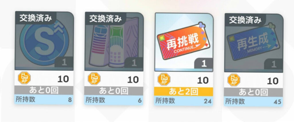 AP交換は再生成チケットが最優先で、逆に再挑戦チケットはそれほど必要ないと思う(とりあえず所持数は10個もあれば十分で、必要になれば交換すればいい)。