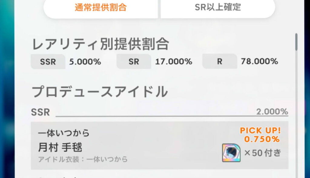 SSRの出現率は基本的に5%なんだけど、キャラクターのSSRは出現率が2%なので、リセマラをするならサポートカードよりもキャラクターのSSRを狙った方がいいと思う。