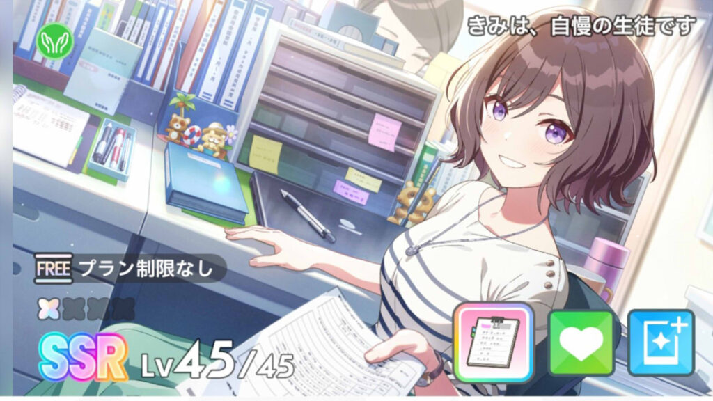 学マスには他のゲームでありがちな人権カードとかも(ランキングに本格的に参加とかをする気がないなら・ストーリーを追いたいだけなら)ないと思うので、基本的に好きなキャラを2体くらい引ければいいと思う。