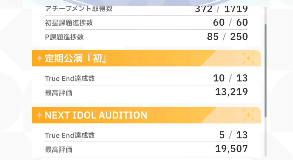 解放条件を見てプレイしないと一生ゲームが進まない。1発クリアを目指さないで、条件を1個ずつ達成していくと遊びやすいと思う。プロデュース評価合計50000の条件がある広とことねは進めるのにちょっと時間がかかると思う。咲季や星南あたりが簡単かもしれない。広は全体的にどのキャラも難しい。
