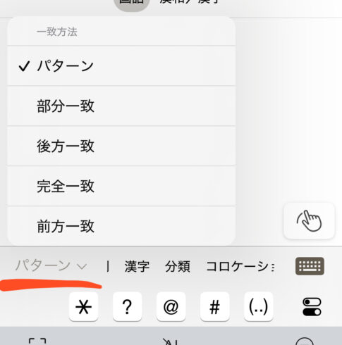 アップデートをしたら左上にあったアスタリスク(検索機能)が消滅したのでそれのメモ。 上記画像にある赤線の部分を長押しすると「パターン」という項目が出現するので、それをタップすれば*(アスタリスク)と同じ機能を使うこと...